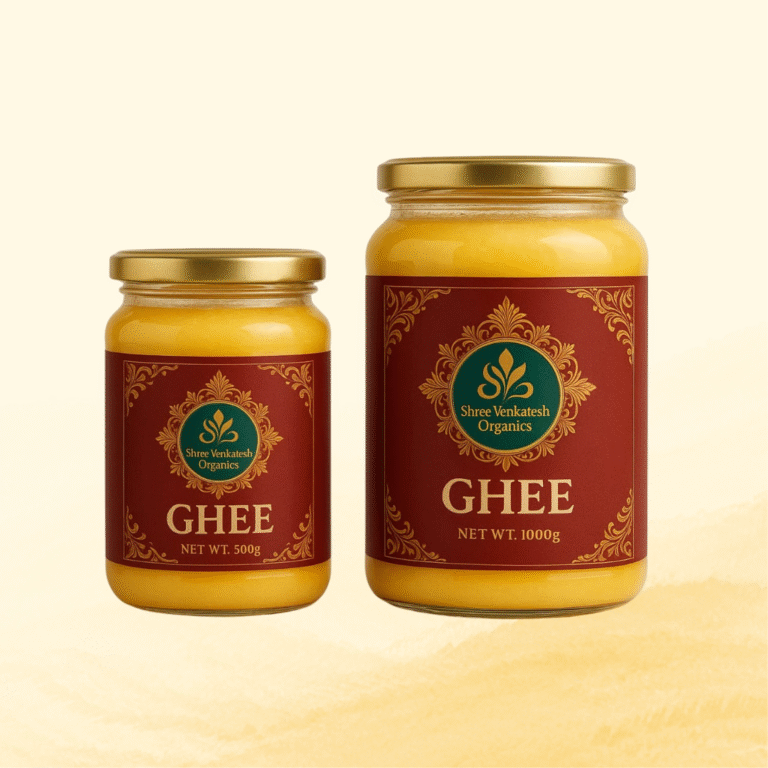 Shree Venkatesh Organics Pure Desi Ghee is crafted from 100% pure cow’s milk using the authentic Bilona (hand-churned) method, ensuring natural aroma, golden color, granular texture, and exceptional nutritional value.